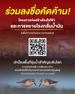 ขอเชิญทุกท่านร่วมลงชื่อคัดค้านโครงการก่อสร้างโรงไฟฟ้าและการขยายโรงกลั่นน้ำมัน ในพื้นที่อำเภอบ้านแหลม จังหวัดเพชรบุรี ที่กำลังจะกลืนกิน “ปอด” ทำลาย”วิถีชีวิต” ของชาวเพชรบุรี รวมถึงระบบนิเวศพื้นที่ชุ่มน้ำชายฝั่งที่เปราะบาง